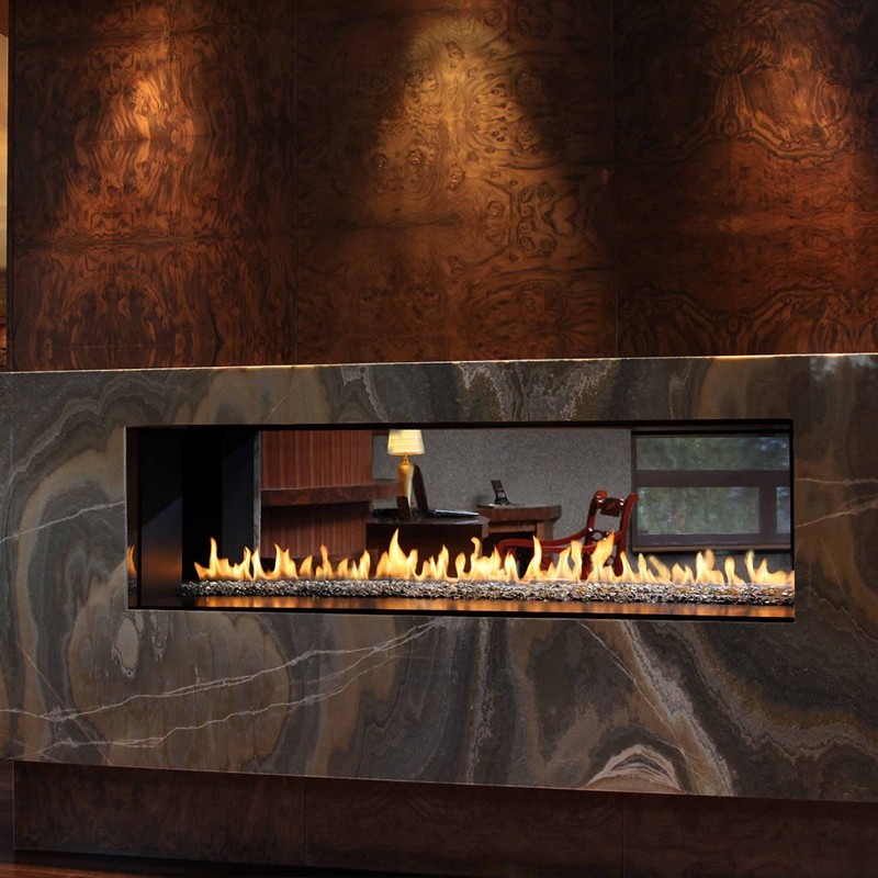 Chimenea de Gas estanca de 185 cm. a 2 caras opuestas, modelo VT166S2BN. Ventilación superior. Funcionamiento a Gas Natural, potencia máxima de hasta 13,2Kw. Módulo de encendido automático. Frente de Cristal Templado Extraclaro.Quemador cerámico con garantía de por vida, piedras decorativas e iluminación complementaria.